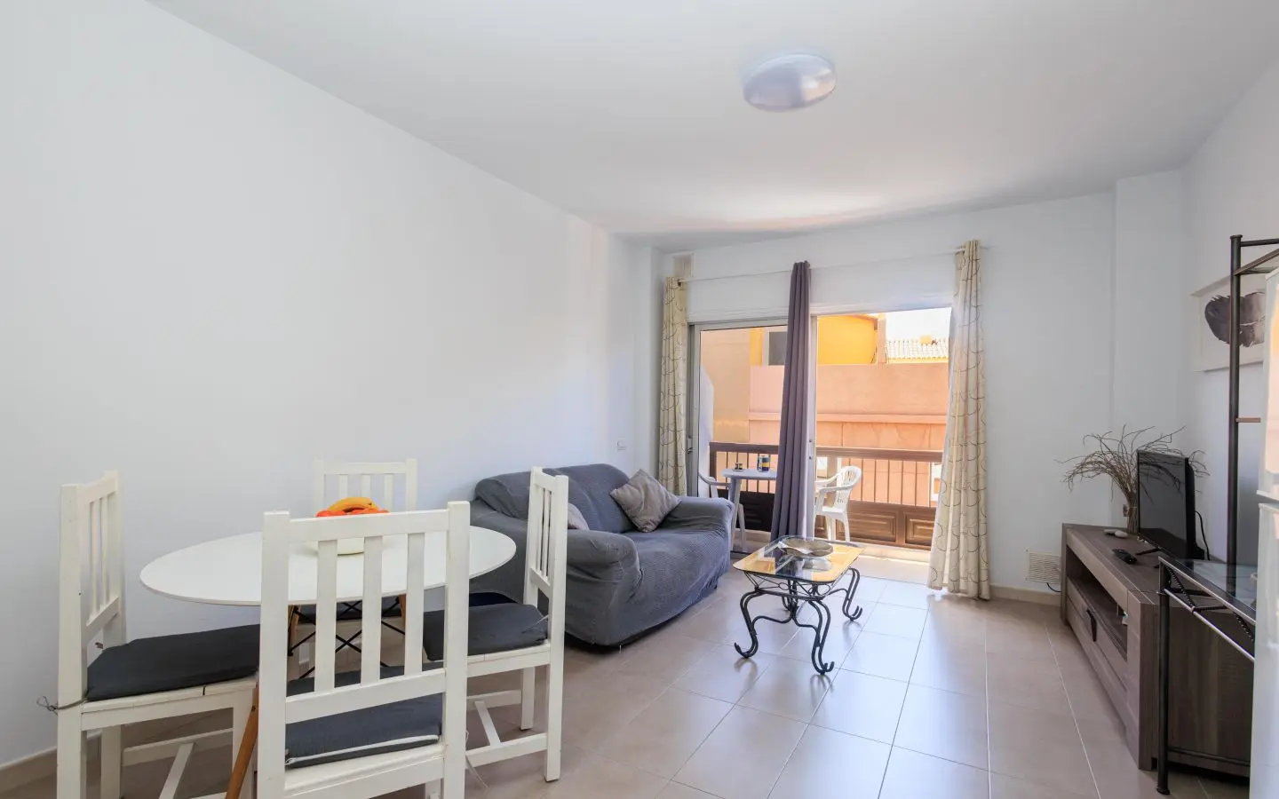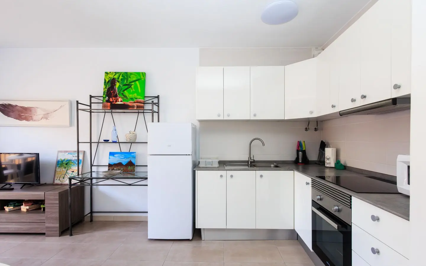 La cocina es abierta y luminosa, y se fusiona con la sala de estar. Aquí puedes preparar comidas sencillas o simplemente relajarte en el sofá. Desde la sala de estar, sales al agradable balcón. Aquí puedes sentarte y observar la vida de la calle de abajo, o simplemente disfrutar del sol. Y cuando te apetece un chapuzón en el mar, solo tienes que bajar las escaleras, ¡así de fácil!